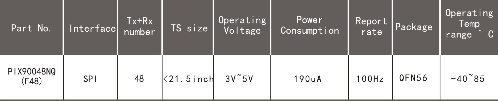 Its special capabilities make the system insensitive to environmental conditions such as temperature, humidity and also other variations. The chip adapts itself to large series resistance of long lines, especially seen when using ITO technology. The device has very low power consumption. The clock is derived from the SPI interface and when the chip is not selected; the current is typically 100 nA.