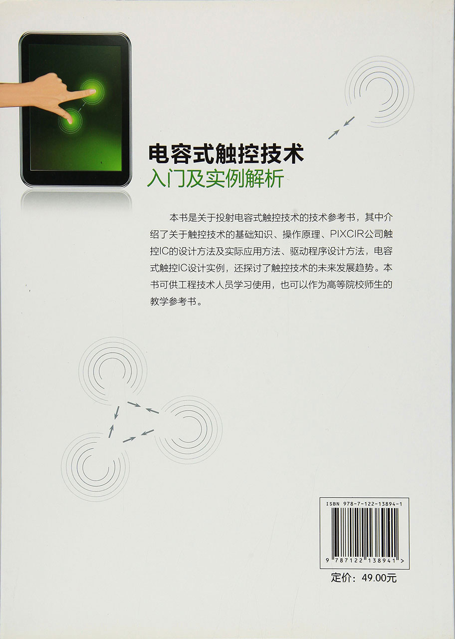 本书是关于投射电容式触控技术的技术参考书,其中介绍了关于触控技术的基础知识、操作原理、PIXCIR公司触控IC的设计方法及实际应用方法、驱动程序设计方法,电容式触控IC设计实例,还探讨了触控技术的未来发展趋势。本书比较专业的介绍了触摸屏原理,让触控不再神秘,具有综合指导价值。